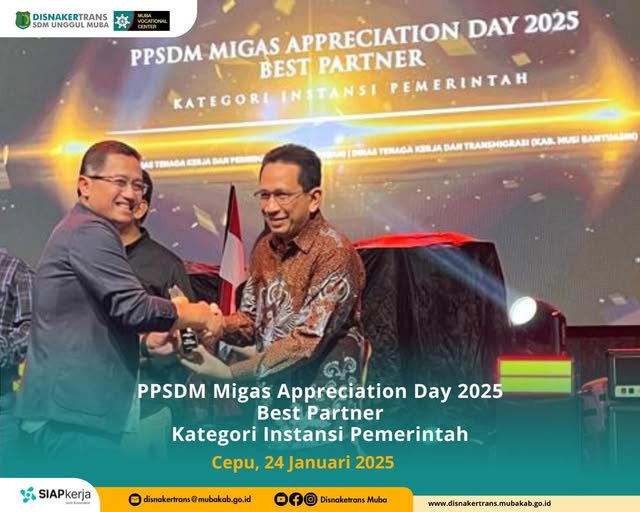 CEPU, MERAHPUTIHNEWS.CO.ID – Dinas Tenaga Kerja dan Transmigrasi (Disnakertrans) Kabupaten Musi Banyuasin baru saja mencetak prestasi membanggakan dengan meraih penghargaan dari Pusat Pengembangan Sumber Daya Manusia Minyak dan Gas Bumi (PPSDM Migas). Penghargaan ini diberikan dalam acara “Partnership Gathering & Appreciation Day PPSDM Migas 2025”,yang berlangsung di Aula Lantai 3, Gedung Utama PPSDM Migas, Cepu, Blora.Senin (24/1/2025) Kerja Sama yang Menginspirasi