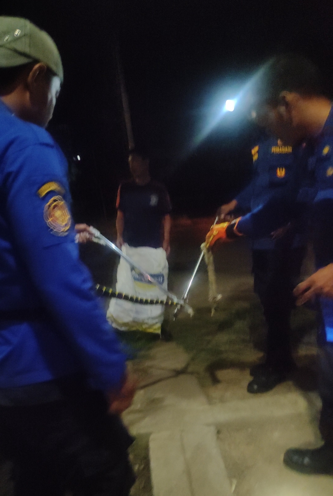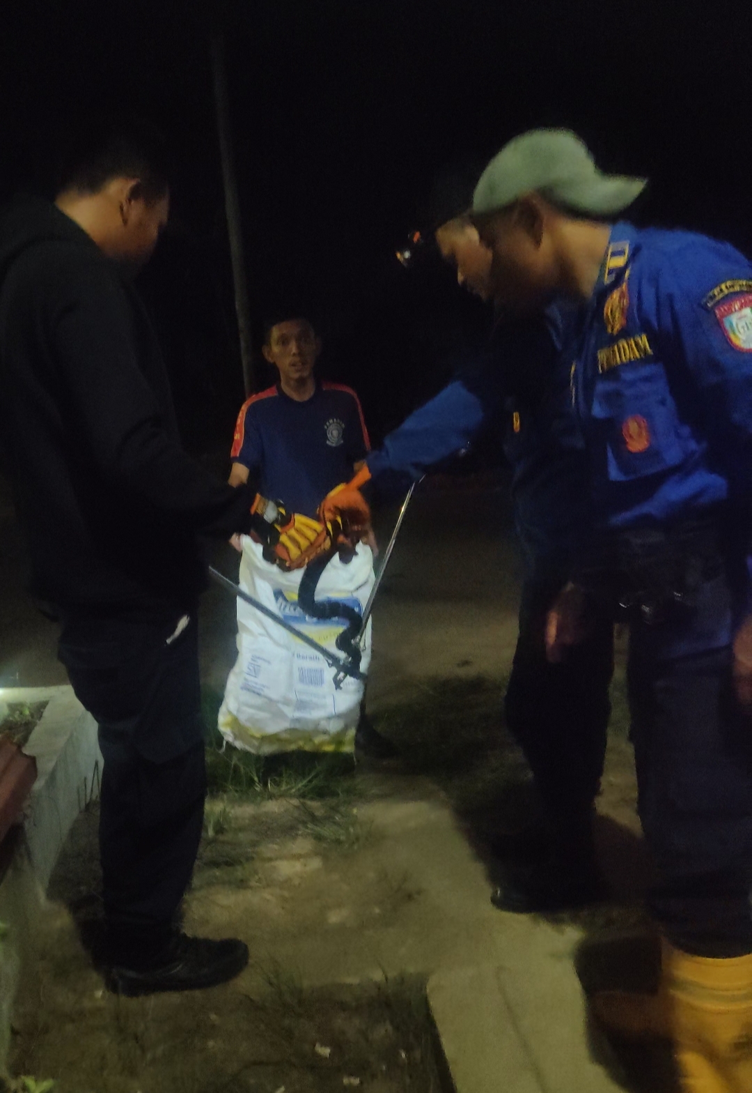 KEDONDONG RAYE, MERAHPUTIHNEWS CO.ID – Tim D Damkar Kabupaten Banyuasin berhasil mengevakuasi seekor ular di rumah warga Jalan KH Sulaiman Kelurahan Kedondong Raye Kecamatan Banyuasin III, setelah mendapat informasi keberadaan ular tersebut melalui Call Center, Rabu (27/08/2025). Malam