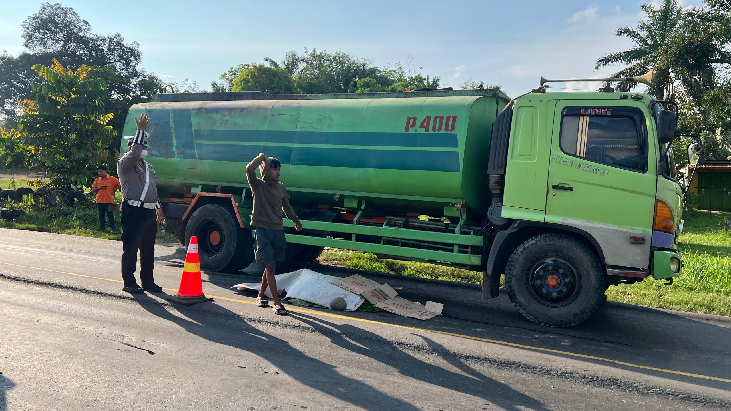 Sa terjatuh kesebelah kiri saat motor yang dikendarai Syam jatuh ketika mau menyalip mobil truk Hino BH 8920 GU yang di kemudikan Dedi Chandra (50) di jalan Palembang Betung KM 37 tepatnya di Desa Langkan Kecamatan Banyuasin III Kabupaten Banyuasin, Kamis (18/9/2025) Sore