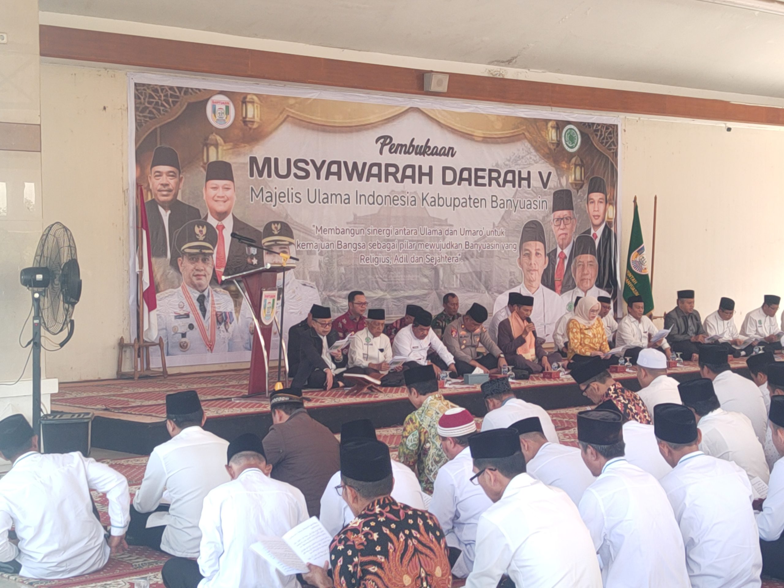 Ketua Majelis Ulama Indonesia Kabupaten Banyuasin Ustad Syamsu Rihal, S.Pdi,.M.Pd meyampaikan pelaksanaan Musda ke V kali ini mengusung tema” Membangun Sinergi antara Ulama dan Umaro untuk kemajuan bangsa sebagai pilar mewujudkan Banyuasin Religius adil dan sejahtera.” Ujar Ketua MUI Banyuasin.