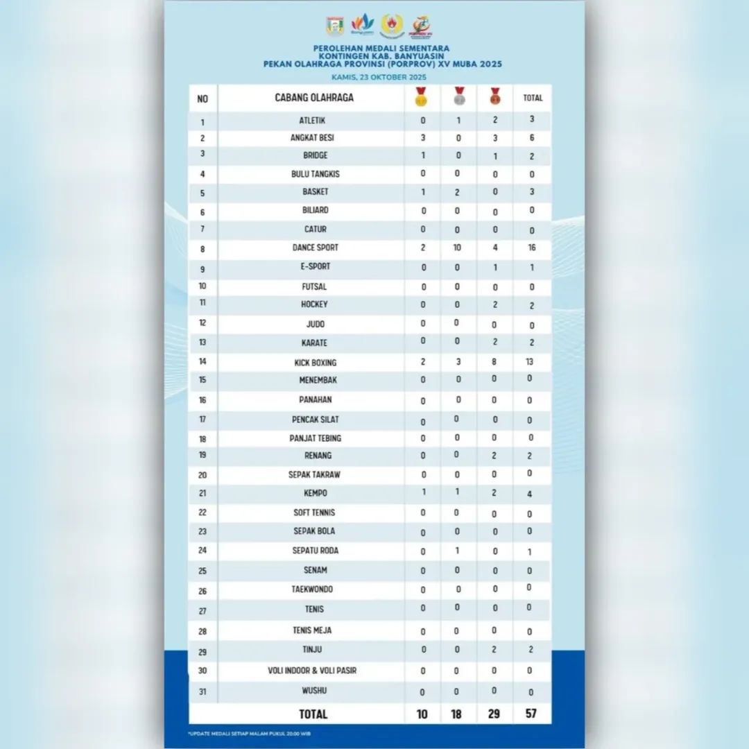 MUSI BANYUASIN, MERAHPUTIHNEWS.CO.ID – Panggung Pekan Olahraga Provinsi (Porprov) XV Sumatera Selatan 2025 di Kabupaten Musi Banyuasin (Muba), seakan menjadi ajang unjuk gigi bagi Kabupaten Banyuasin. Hingga Rabu malam (23/10/2025) pukul 22.00 WIB, kontingen muda Bumi Sedulang Setudung sukses mengguncang klasemen sementara dengan torehan medali sebanyak 59 terdiri dari, 10 emas, 18 perak, dan 31 perunggu dengan bertengger di peringkat 12, dan hanya selisih tipis dari Kabupaten Pali.