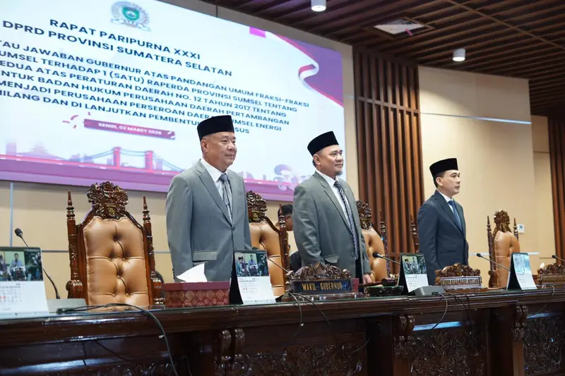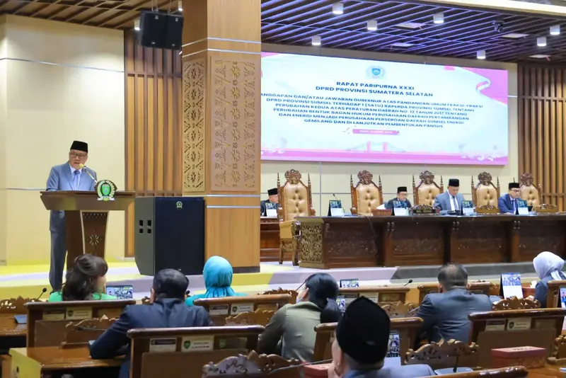 PALEMBANG, MERAHPUTIHNEWS.CO.ID – Dewan Perwakilan Rakyat Daerah (DPRD) Provinsi Sumatera Selatan (Sumsel)menggelar Rapat Paripurna XXXI dengan agenda tanggapan dan/atau jawaban Gubernur atas pandangan umum fraksi-fraksi terhadap Rancangan Peraturan Daerah (Raperda) tentang perubahan bentuk badan hukum Perusahaan Daerah (PD) Pertambangan dan Energi menjadi Perusahaan Perseroan Daerah (Perseroda) Sumsel Energi Gemilang. Rapat dilaksanakan pada Senin (2/3/2026) di ruang rapat paripurna DPRD Sumsel