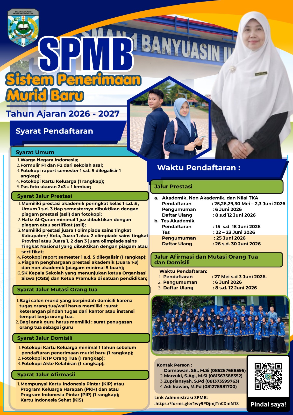 PANGKALAN BALAI, MERAHPUTIHNEWS.CO.ID – Memasuki tahun pelajaran baru 2026/2027 SMAN 1 Banyuasin III kembali membuka Sistem Penerimaan Murid Baru (SPMB) tahun 2026. Terbagi dari dalam 4 jalur (Jalur domisili, jalur afirmasi, prestasi dan jalur mutasi orang tua). Adapun jalur Prestasi terbagi 4 kategori (Akademik, non akademik dan nilai TKA dan jalur tes). Untuk pendaftaran jalur afirmasi, domisili dan prestasi pendaftaran dimulai tanggal 25 Mei s/d 3 Juni 2026 dan akan di umumkan tanggal 6 Juni 2026. Apabila tidak termasuk dalam seleksi Afirmasi, domisili dan prestasi akan dilakukan seleksi jalur akademik.